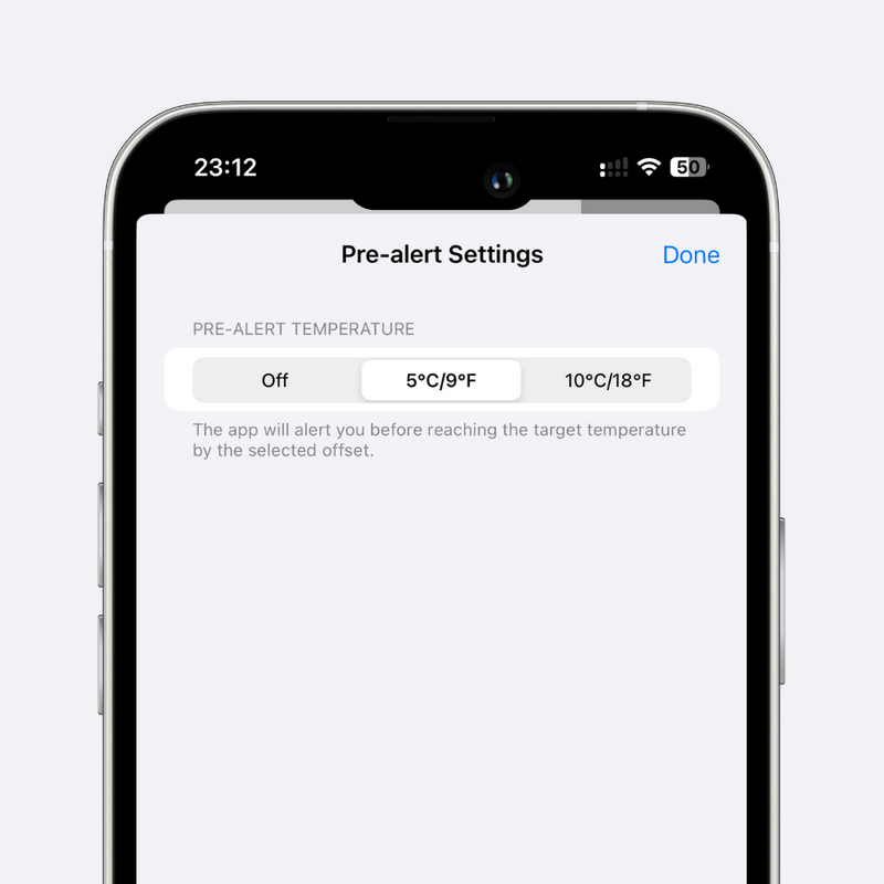 Many of our users asked for a solution, and we listened! We've thoughtfully added two pre-alarm options—9°F and 18°F below the target temperature. By default, you'll get a pre-alert at 9°F, giving you plenty of time to act with confidence.