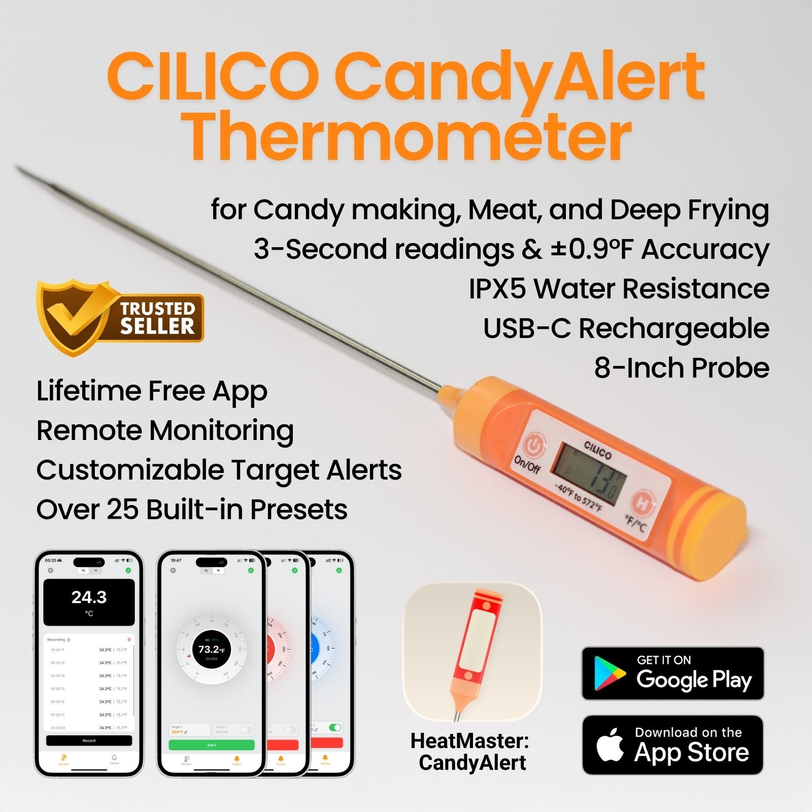 The CILICO CandyAlert is a smart food thermometer that connects to your smartphone via Bluetooth. With our exclusive, free app, you can remotely monitor temperatures, set target temperatures, and receive alerts directly on your phone.